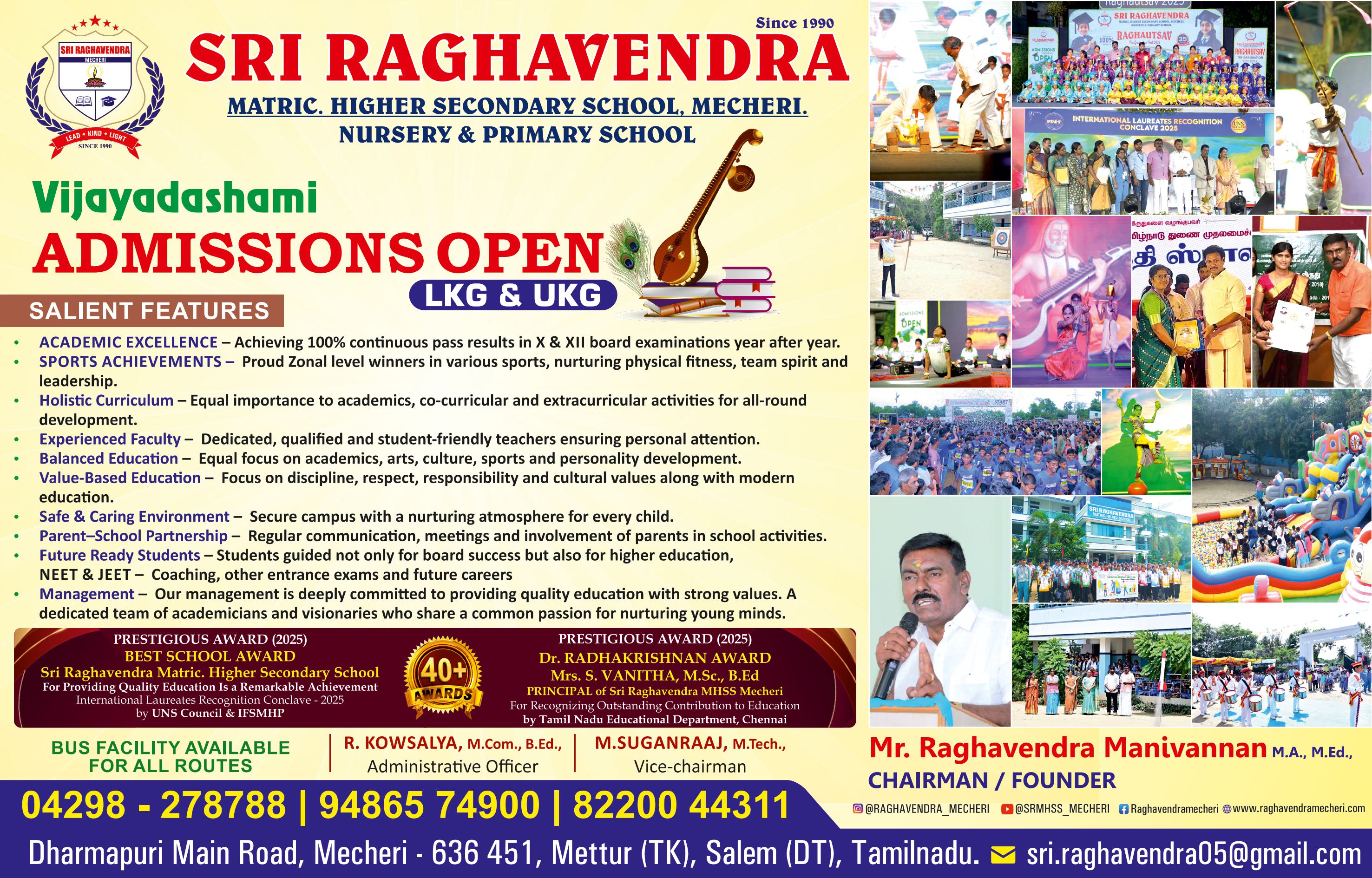 The Founder of our school Thiru.Raghavendra Manivannan, was a self-made man who came up from humble origins to establish the Sri Raghavendra Educational Trust.